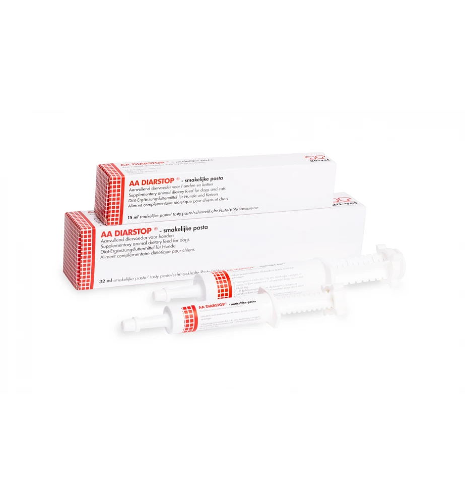 AA Diarstop Pasta is een orale smakelijke pasta die ingezet kan worden bij honden en katten ter vermindering van acute darmabsorptiestoornissen zoals diarree of dunne ontlasting. De orale pasta heeft een verzachtende werking op het darmslijmvlies en zorgt ervoor dat de ontlasting weer normaal van consistentie wordt en ondersteunt het herstel van de natuurlijke vochtbalans in het maag- en darmstelsel.